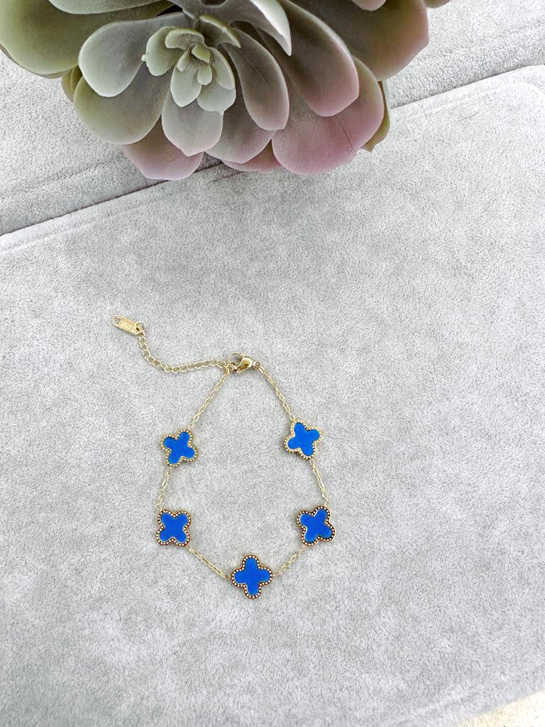 This blue bracelet with 5 clover charms is the perfect accessory to complete any outfit. Crafted with precision and expertise, this bracelet adds a touch of elegance and charm. Each clover symbolizes luck and good fortune, making it a meaningful addition to your collection. Enhance your style and bring luck your way with this beautifully crafted bracelet.