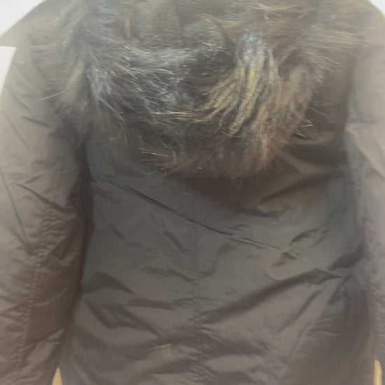 Kids Brave Soul black longline parka coat with faux fur lined hood, four outer pockets and full front zip & button fastening.