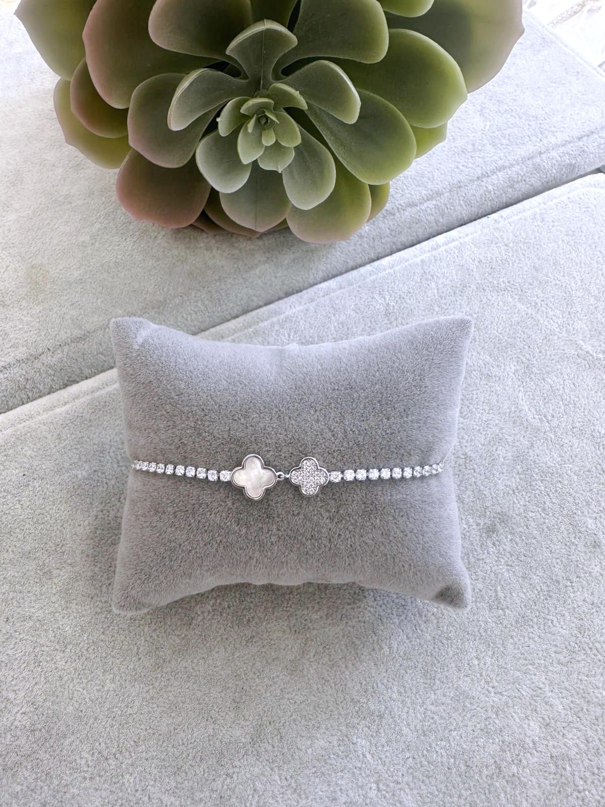 This elegant bracelet showcases two clover charms, one featuring an iridescent design and the other a dazzling diamond. Made of stainless steel, it won't tarnish and can even be worn underwater. The perfect accessory for both formal occasions and everyday wear.
