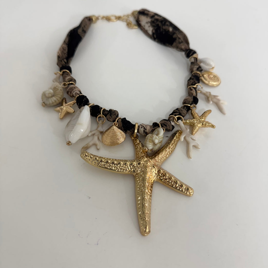 This elegant necklace features a beautiful combination of fabric, gold starfish, and shell. The fabric adds a touch of softness, while the starfish and shell add a touch of oceanic charm. Perfect for any occasion and will be a stunning addition to any outfit.