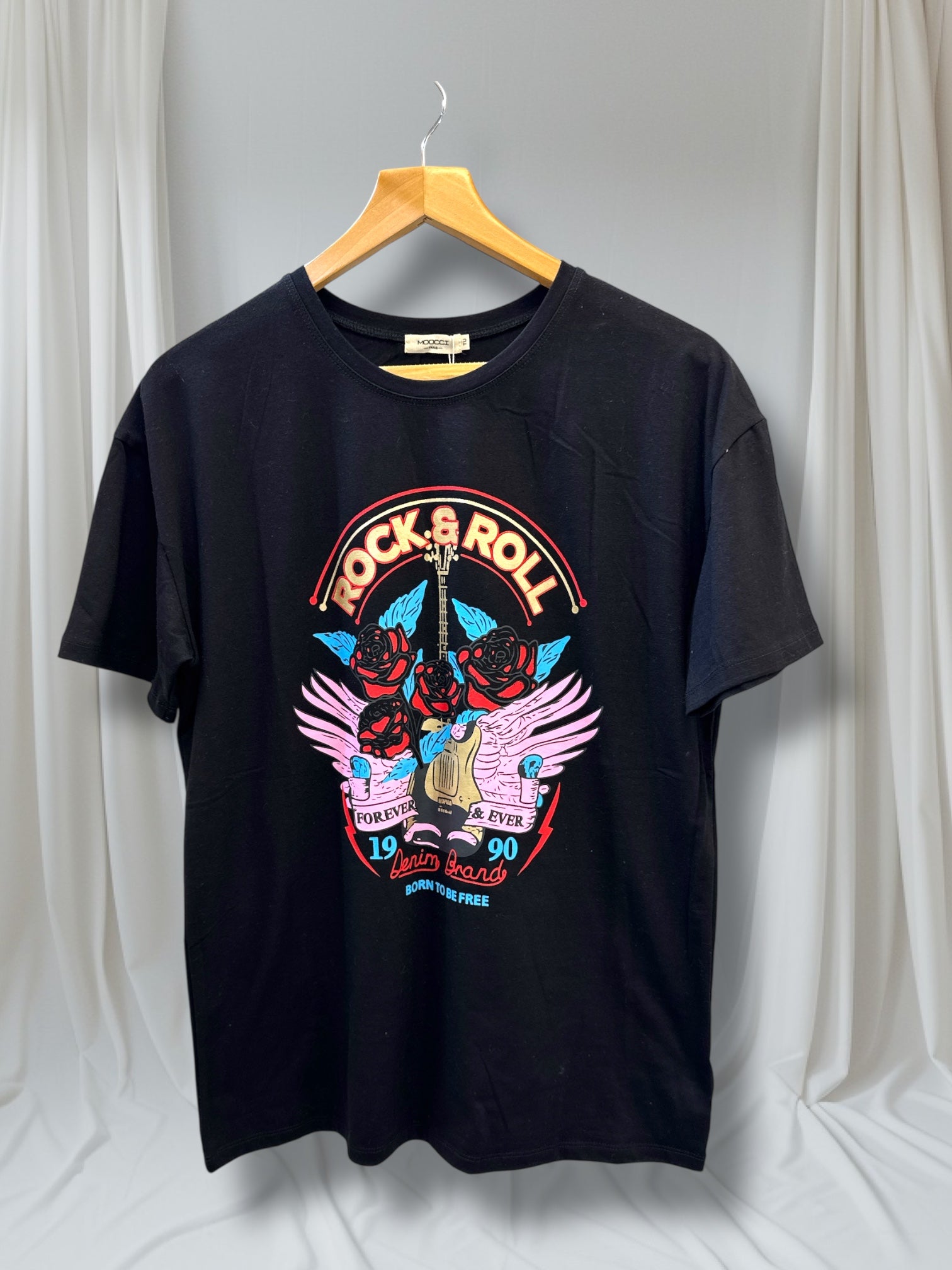 As an industry expert, experience the timeless style and versatility of our black Rock ‘n’ roll T-shirt. Its free size design fits up to size 14, making it perfect for any occasion. Revamp your wardrobe with this beautiful and comfortable must-have.
