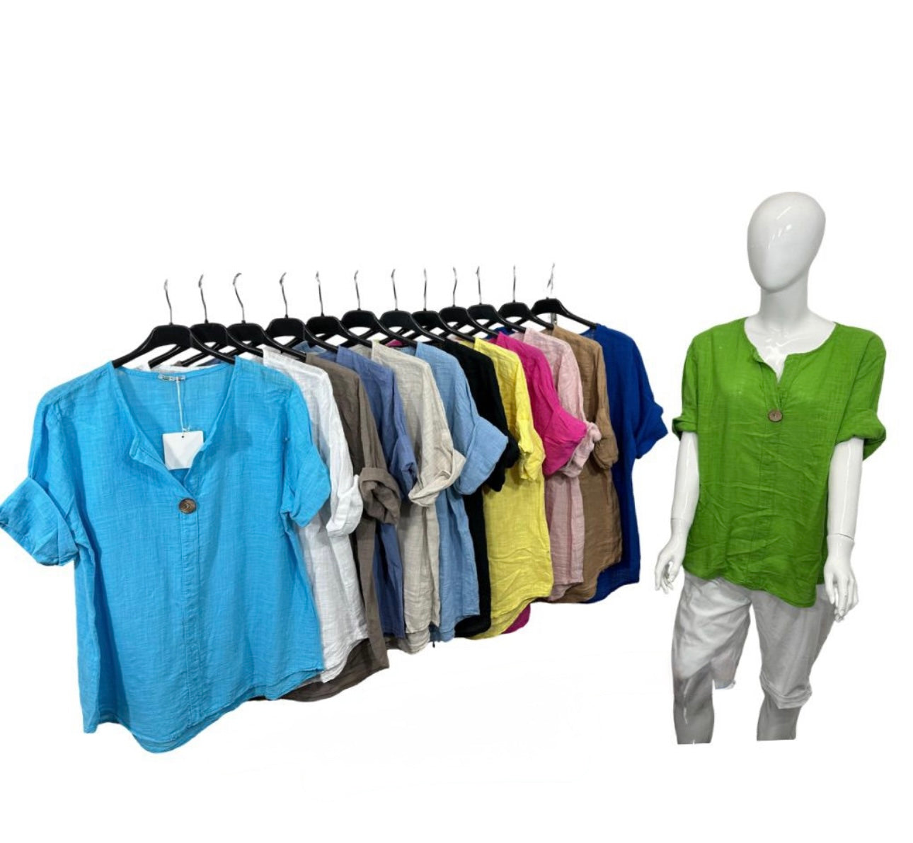 Victoria top comes with one button solid That’s all 100% cottonAs an industry expert, I can confidently say that the Victoria Top offers a 100% cotton material with a one-button solid design. This top is both versatile and comfortable, making it a perfect addition for any wardrobe.