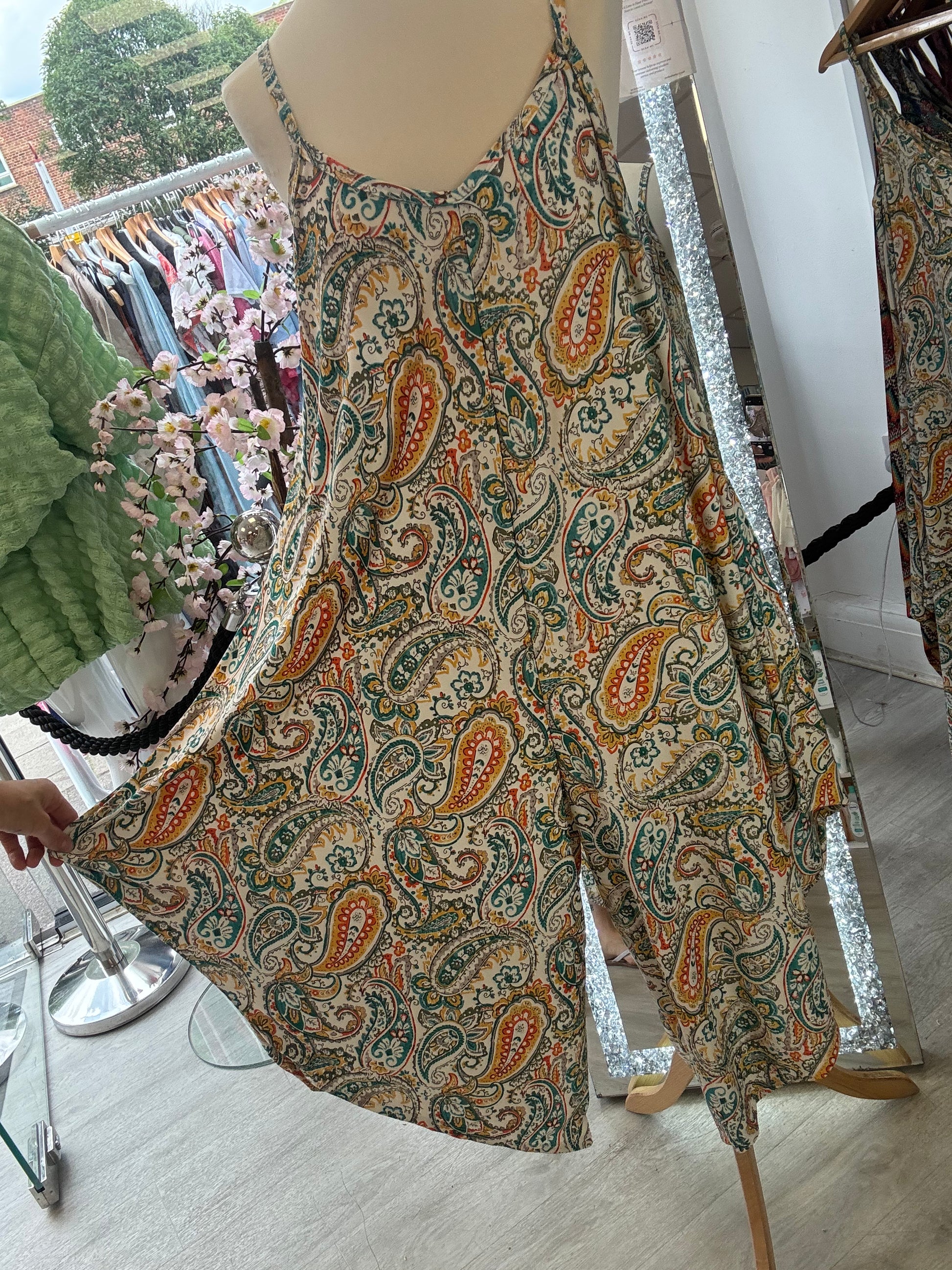 This white paisley jumpsuit features a modern and stylish design, perfect for any occasion. Made with high-quality materials, it offers comfort and durability while making a statement. The intricate paisley pattern adds a touch of elegance to the overall look. Elevate your wardrobe with this trendy jumpsuit.